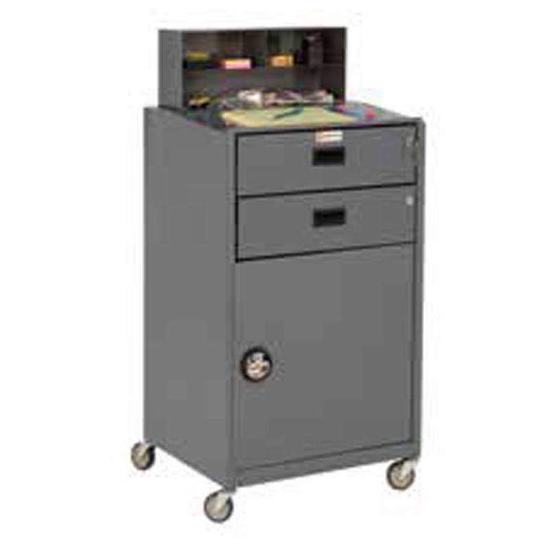 Chariot mobile en acier robuste de calibre 16-22 avec fini texturé noir durable. Possède deux tiroirs de rangements de 6’’ sur roulement à billes et une armoire contenant 2 tablettes. Tous les espaces de rangement possèdent une barrure et une clef commune. Coordonner avec les casiers à 4 tiroirs /260-R4B ou /260-R4F et l’armoire cabinet à porte simple #260-1P ou tout autres produits modulaires de même dimension. Le chariot est pré-perforé pour fixer ces produits. 4 roulettes pivotantes pour faciliter les déplacements.