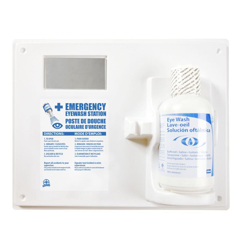 Single Eyewash Station with 1L Eyewash Solution. Designed for quick decontamination of eyes or skin that has been exposed to harmful chemicals. Mirror included in order to view contaminated eye or face. Eyewash board made of durable, high-impact plastic. Wall mountable for easy access. Features 4 pre-drilled holes for easy mounting or relocation
