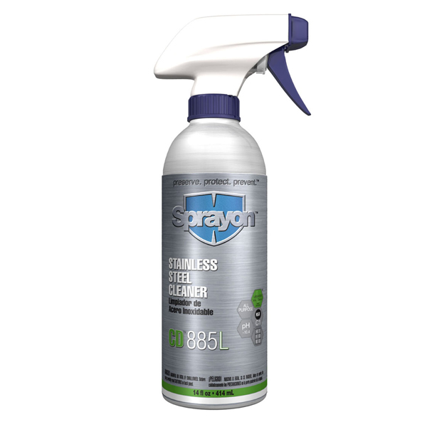 Le nettoyant pour acier inoxydable CD™885 de Sprayon® nettoie, polit, fait briller et protège l’acier inoxydable et autres surfaces métalliques comme le chrome et l’aluminium.